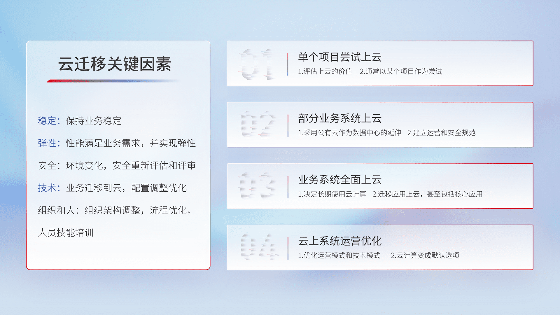 结合实际业务,,从规划设计、、、、云平台选型、、、云原生改造、、、、数据迁移、、集成交付,,迁移全过程为客户识别最佳上云路径,,,,做好风险识别管理,,,设计网络架构、、身份权限、、、安全审计合规、、操作审计、、、、日志审计、、、监控告警策略、、多站点容灾设计等,,,对云上基础设施进行整体规划,,,提升IT治理水平,,以满足弹性、、高可用、、高性能的需求。。。。